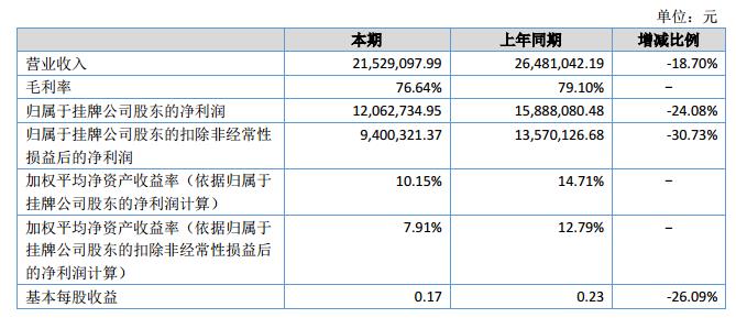 截止2018年6月30日,公司總資產(chǎn)12,469.41萬(wàn)元,凈資產(chǎn)為9,832.01萬(wàn)元。2018年上半年,公司實(shí)現(xiàn)營(yíng)業(yè)收入2,152.91萬(wàn)元,同比減少18.70%,營(yíng)業(yè)成本502.89萬(wàn)元,利潤(rùn)總額和凈利潤(rùn)分別為1,394.60萬(wàn)元和1,199.40萬(wàn)元,較去年同期有所下降。?