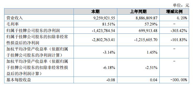 報告期內(nèi),公司營業(yè)收入926.00萬元,較上期增加4.2%,營業(yè)成本171.17萬元,較上期減少54.90%,營業(yè)成本降低主要原因系公司報告期內(nèi)以自產(chǎn)試劑銷售為主,未銷售毛利潤較低的檢測儀器設(shè)備,故毛利率較上年同期提高81.51%;本期凈利潤-142.38萬元,較上期減少303.42%,費(fèi)用增加主要系公司改變銷售模式,引入第三方專業(yè)銷售服務(wù)公司,及公司管理層決定2018年開展生殖毒理檢測試劑盒產(chǎn)業(yè)化項(xiàng)目,前期投入費(fèi)用較多。?