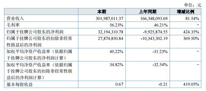報(bào)告期內(nèi),公司實(shí)現(xiàn)營(yíng)業(yè)收入30,198.70萬(wàn)元,同比增長(zhǎng)了81.54%;營(yíng)業(yè)利潤(rùn)3,931.80萬(wàn)元,同比增長(zhǎng)了715.54%;凈利潤(rùn)為3,204.40萬(wàn)元,同比增長(zhǎng)了423.09%。截止2018年06月30日,公司注冊(cè)資本4,855萬(wàn)元,總資產(chǎn)為42,688.28萬(wàn)元,總資產(chǎn)增長(zhǎng)率40.83%;凈資產(chǎn)為10,225.50萬(wàn)元,凈資產(chǎn)增長(zhǎng)率70.60%。?