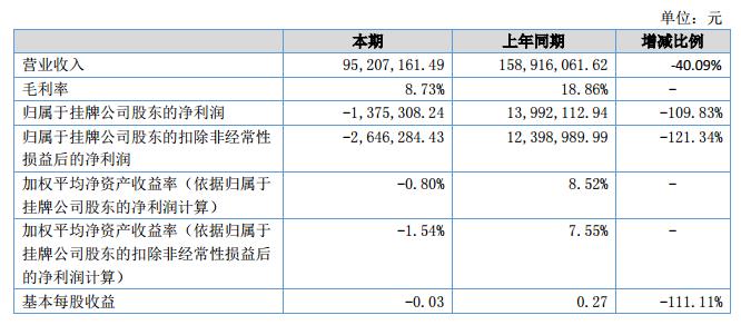公司實(shí)現(xiàn)主營(yíng)業(yè)務(wù)收入為9,196.69萬(wàn)元,較上年同期減少了6,216.34萬(wàn)元,降幅為40.33%,主營(yíng)業(yè)務(wù)成本為8,371.73萬(wàn)元,較上年同期減少了4,099.98萬(wàn)元,降幅為32.87%,導(dǎo)致主營(yíng)業(yè)務(wù)毛利從上年同期的19.08%下降至本年的8.97%;公司主營(yíng)業(yè)務(wù)利潤(rùn)為-195.20萬(wàn)元,較上年同期減少了1,735.45萬(wàn)元,下跌112.67%,2018年度1-6月公司凈利潤(rùn)為-137.53萬(wàn)元,較上年同期減少了1,536.74萬(wàn)元,減幅為109.83%。?