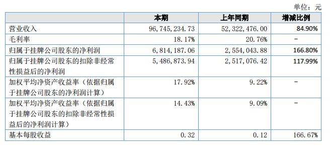 公司在報(bào)告期內(nèi)的主營(yíng)業(yè)務(wù)收入為96,745,234.73元,較去年同期增長(zhǎng)44,422,758.73元,增幅84.90%;成本及費(fèi)用90,373,766.29元,較去年同期增長(zhǎng)41,100,857.46元,增幅83.42%,歸屬于母公司的凈利潤(rùn)為6,814,187.06元,較去年同期增加4,260,143.18元,增幅166.80%。?