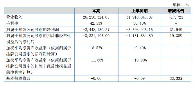 公司實(shí)現(xiàn)營(yíng)業(yè)收入2,625.63萬(wàn)元,較上年同期降低17.72%;營(yíng)業(yè)成本為1,508.93萬(wàn)元,較上年同期減少32.05%;實(shí)現(xiàn)凈利潤(rùn)-244.82萬(wàn)元,比上年同期增加31.94%。?