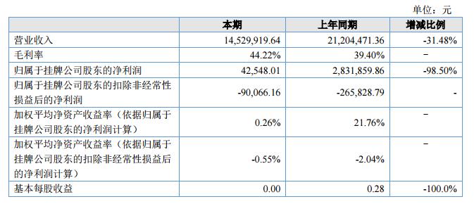 報(bào)告期內(nèi)公司實(shí)現(xiàn)營業(yè)收入14,529,919.64元,較上年同期減少6,674,551.72元,降幅為31.48%,本期凈利潤42,548.01元,較上年同期減少2,789,311.85元,主要是營業(yè)收入減少本期毛利減少1,930,966.12元。