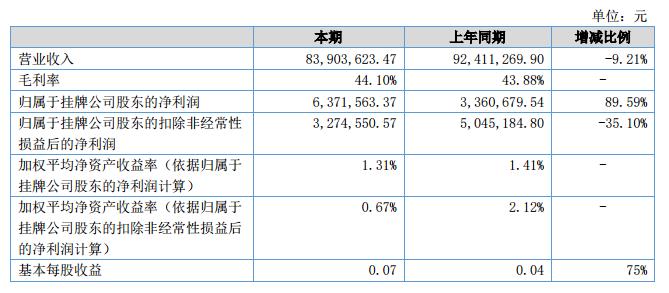 報(bào)告期內(nèi),公司實(shí)現(xiàn)83,903,623.47元的收入規(guī)模,公司管理層按照董事會(huì)制定的戰(zhàn)略規(guī)劃和經(jīng)營計(jì)劃,公司堅(jiān)持以市場為導(dǎo)向,通過提升服務(wù)質(zhì)量,促進(jìn)主營業(yè)務(wù)的穩(wěn)健發(fā)展。2018年1-6月,公司實(shí)現(xiàn)營業(yè)收入83,903,623.47元,與去年同期92,411,269.91元相比,略有下降。公司實(shí)現(xiàn)歸屬于掛牌公司股東的凈利潤6,371,563.37元,較去年同期3,360,679.54元,有一定幅度提升。?