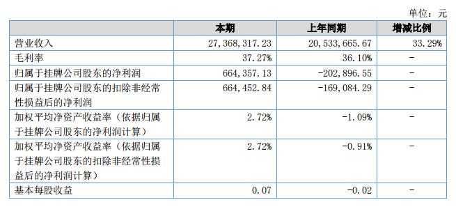 報(bào)告期內(nèi),公司實(shí)現(xiàn)營業(yè)收入2,736.83萬元,較2017年同期上升683.47萬元,同比上升33.29%,主要原因系公司所處激光類產(chǎn)品行業(yè)景氣度提升,公司產(chǎn)品需求增加,公司產(chǎn)品的生產(chǎn)和發(fā)貨量增長,導(dǎo)致收入增加所致歸屬于母公司股東的凈利潤66.44萬元,較2017年同期上升86.73萬元。?