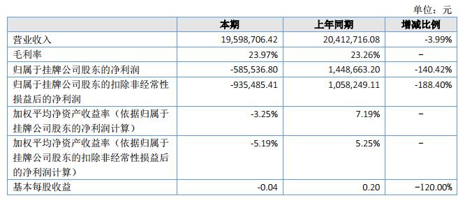 2018年上半年,公司實現(xiàn)營業(yè)收入19,598,706.42元,較上年同期減少814,009.66元,同比下降3.99個百分點,主要原因是市場競爭加劇,公司為保持市場占有率,產(chǎn)品價格小幅下調(diào),受此影響銷售收入同比下降。2018年上半年實現(xiàn)凈利潤-585,536.80元,同比減少2,034,200.00元。?