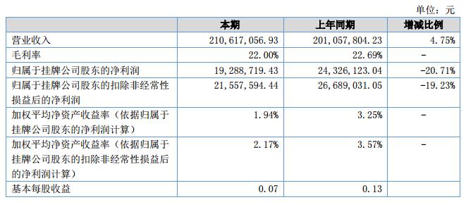 報(bào)告期內(nèi),公司資產(chǎn)總額為1,301,373,222.62元,負(fù)債總額200,246,355.86元,資產(chǎn)負(fù)債率15.39%,歸屬于母公司所有者凈資產(chǎn)總額1,001,608,213.27元。實(shí)現(xiàn)營業(yè)收入210,617,056.93元,同比增長(zhǎng)4.75%;營業(yè)成本164,281,943.14元,同比增加了5.69%;毛利率22.00%;凈利潤27,520,033.66元。報(bào)告期內(nèi),公司財(cái)務(wù)狀況總體保持穩(wěn)定。?