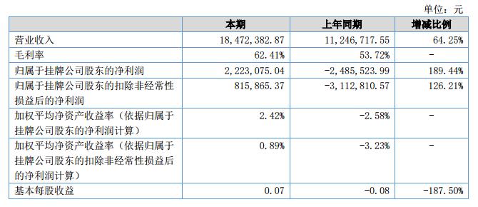 公司2018年上半年營業(yè)收入為18,472,382.87元,較上年增長64.25%,2018年上半年營業(yè)成本為6,943,814.78元,同比增長33.41%,營業(yè)收入的增長導致營業(yè)成本的增長;毛利率為62.41%,較上年同期的53.72%也有所增長,最終實現凈利潤2,223,075.04元,較去年同期大幅上漲189.44%,收益同比大幅度增長所致。