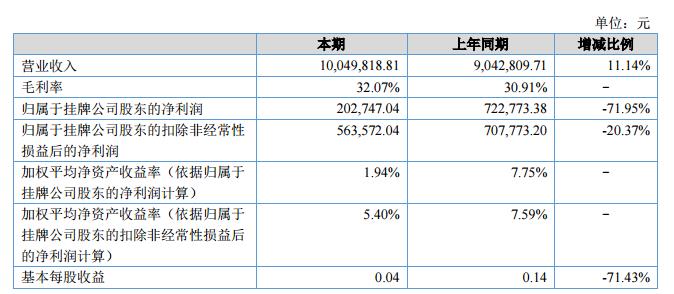 公司實現(xiàn)營業(yè)收入1,004.98萬元,較去年同期增長11.14%;公司實現(xiàn)凈利潤20.27萬元,較去年同期減少71.95%。?