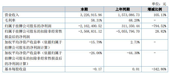 報告期內(nèi),公司實現(xiàn)營業(yè)收入322.69萬元,較上年同期增長了105.13%;凈利潤為-213.83萬元,較上年同期減少了241.24萬元,下降率880.02%;收入在前期市場投入及渠道建設(shè)積累的基礎(chǔ)上實現(xiàn)了穩(wěn)定增長,利潤下降的主要原因系研發(fā)投入較上年同期上升幅度較大、及收到政府補助較上年同期下降幅度較大所致。