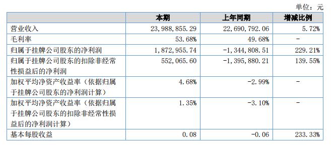 2018年上半年實現(xiàn)銷售收入2,398.89萬元,較上年同期增長5.72%;利潤總額305.58萬元,較上年同期增長683.46%;凈利潤200.16萬元,較上年同期增長247.39%。?