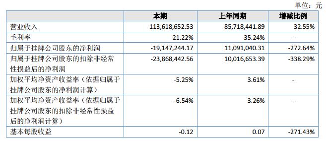 公司在報告期內(nèi)的主營業(yè)務(wù)收入為113,618,652.53元,同比上年度增長32.55%;營業(yè)成本為89,513,290.01元,同比上年度增長61.26%;歸屬于母公司的凈利潤為-19,147,244.17元,同比上年變動率為-272.64%。?