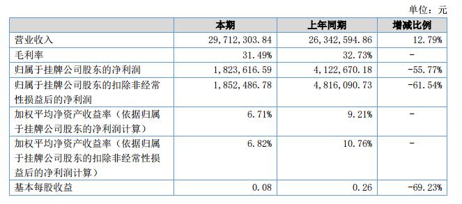 2018年1-6月實現(xiàn)銷售收入29,712,303.84元,比去年同期26,342,594.86元增加3,369,708.98元,較去年同期增加12.79%。主要原因是公司本期竣工驗收項目較上年同期增加所致。營業(yè)成本:2018年1-6年發(fā)生營業(yè)成本20,355,727.77元,比去年同期17,719,497.10元增加2,636,230.67元,較去年同期增加14.88%,主要是因為本期竣工驗收項目增加,所對應(yīng)結(jié)轉(zhuǎn)的成本亦增加。凈利潤2018年1-6月實現(xiàn)凈利潤1,823,616.59元,比去年同期4,122,670.18元減少-2,299,053.59元,主要原因:一方面,由于2018年1-6月支付公司掛牌中介機構(gòu)服務(wù)費用增加,從而導(dǎo)致管理費用增加所致;另一方面,受2018年1-6月2017年1-6月少數(shù)股東損益變動的影響。?