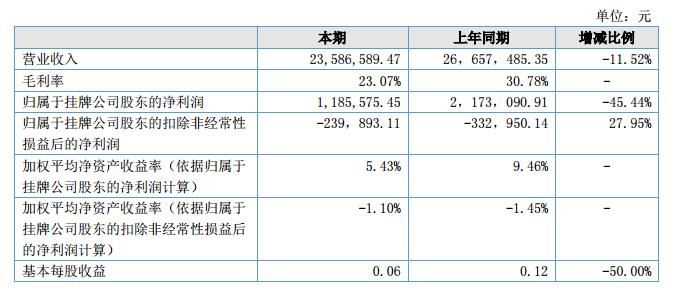 2018年1-6月,公司營業(yè)收入為2358.66萬元,同比減少11.52%;公司營業(yè)成本1,814.56萬元,同比減少1.66%;凈利潤為118.56萬元,同比減少45.44%;本期期末每股收益為0.06元。公司上半年整體發(fā)展趨勢(shì)較好,雖然銷售較上年同期有一定比例的減少,但公司仍有較多的盈利,主要原因是上半年政府補(bǔ)助有可觀的收入。?