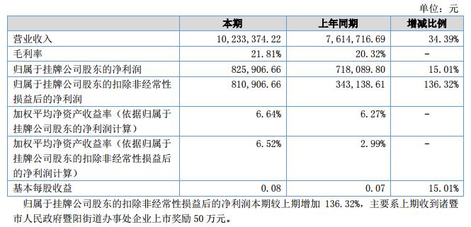 上半年實現(xiàn)營業(yè)收入10,233,374.22元,上年同期實現(xiàn)收入7,614,716.69元,同比增加34.39%,主要原因為:公司廣告牌設(shè)計制作和發(fā)布收入增長幅度加大,本期實現(xiàn)收入8,674,506.30元,較上年同期增長1155.30%;上半年公司實現(xiàn)凈利潤825,906.66元,上年同期實現(xiàn)凈利潤718,089.80元,同比增加15.01%。?