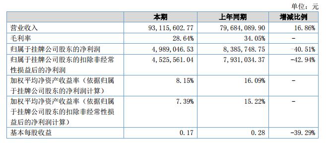 報告期內(nèi),公司營業(yè)收入達到93,115,602.77元,較上年同期增長16.86%;營業(yè)成本為66,446,143.83元,較上年同期增長26.44%;公司凈利潤為4,989,046.53元,較上年同期減少40.51%。在報告期內(nèi),營業(yè)收入同比增長的原因是因為公司業(yè)務(wù)增長,但由于人工成本和化工原原材料成本的不斷攀升,導(dǎo)致公司同比營業(yè)成本上升、凈利潤下滑。報告期內(nèi),公司的資產(chǎn)合計為156,546,594.03元,負(fù)債合計為92,773,365.50元,所有者權(quán)益合計為63,773,228.53元,其中資產(chǎn)增加14.95%,負(fù)債增加19.72%,資產(chǎn)負(fù)債率為59.26%,較上年同期上漲了6.96個百分點,公司總體情況同比去年基本持平,公司總體經(jīng)營狀況保持平穩(wěn)發(fā)展。?