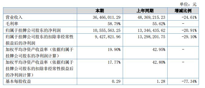 報(bào)告期內(nèi),公司營(yíng)業(yè)收入3,646.60萬(wàn)元,比上年同期相比下降24.61%,實(shí)現(xiàn)歸屬于掛牌公司股東的凈利潤(rùn)1,055.55萬(wàn)元,經(jīng)營(yíng)活動(dòng)產(chǎn)生的現(xiàn)金流量?jī)纛~1,302.58萬(wàn)元。?