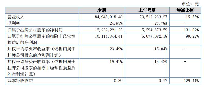 報(bào)告期內(nèi)公司實(shí)現(xiàn)營業(yè)收入84,943,918.48元,較上年同期增長了15.55%;營業(yè)成本63,765,742.24元,較上年同期增加了13.8%;實(shí)現(xiàn)凈利潤12,232,221.33元,較上年同期增長了131.02%;成本的增長率低于營業(yè)收入的增長率,公司的盈利能力不斷增強(qiáng)。報(bào)告期內(nèi),公司總資產(chǎn)84,241,638.37元,同比增長10.43%,凈資產(chǎn)58,247,931.26元,同比增長了26.58%。?