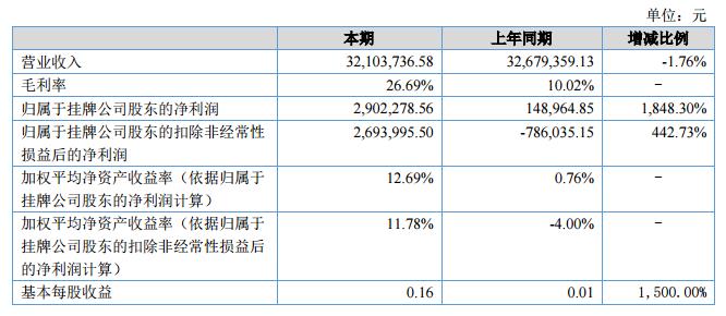 報(bào)告期內(nèi),公司營(yíng)業(yè)收入3,210.37萬(wàn)元,較上年同期下降1.76%;利潤(rùn)總額339.35萬(wàn)元,比上年同期增長(zhǎng)1,112.88%;凈利潤(rùn)290,23萬(wàn)元,比上年同期增長(zhǎng)1,848.30%,主要原因是加強(qiáng)了對(duì)各職能部門進(jìn)行了的KPI考核,產(chǎn)品毛利上升。?