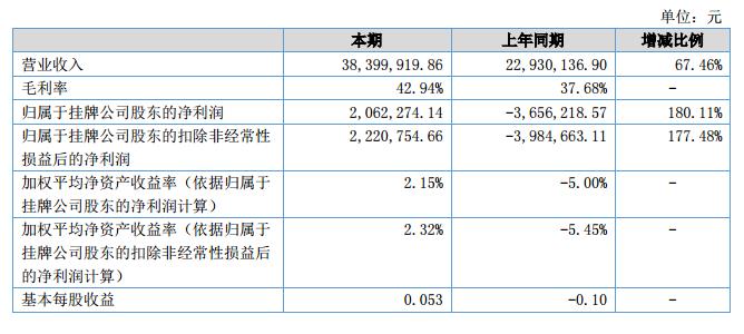 報告期內(nèi),公司實現(xiàn)營業(yè)收入38,399,919.86元,同比增長67.46%。主要原因為:受益公司對銷售市場的重新布局,積極發(fā)展新的銷售渠道,完善已有銷售模式。報告期內(nèi),公司產(chǎn)品毛利率42.94%,與去年同期產(chǎn)品毛利率37.68%有較大增長。主要原因為:公司對采購市場的價格上漲的預(yù)判,及時鎖定了部分材料價格,避免了材料成本上升帶來成本增加,同時公司加強了對生產(chǎn)車間的管理,使生產(chǎn)效率有了大幅提高。報告期內(nèi),公司的凈利潤1,634,033.82元,同比增長138.28%。主要原因為:報告期銷售收入的增長帶來的毛利貢獻增加,同時成本費用控制到位未出現(xiàn)大幅度變化。?