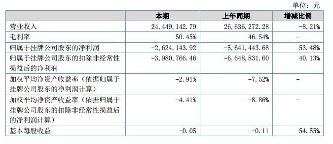 報告期內(nèi),公司實現(xiàn)營業(yè)收入2,444.91萬元,同比減少218.71萬元,降幅8.21%;本期營業(yè)成本1,211.38萬元,同比減少212.58萬元,降幅14.93%;本期歸屬于母公司凈利潤-262.41萬元,同比增長301.73萬元,增幅53.48%。報告期內(nèi)公司軟件收入保持增長,因系統(tǒng)集成業(yè)務的毛利率太低,公司縮減了此類業(yè)務的推廣,系統(tǒng)集成收入的下降是導致營業(yè)收入和營業(yè)成本下降的主要原因。歸屬于母公司凈利潤的增長,主要原因為報告期內(nèi)控制成本、精減人員,從而使期間費用減少了315.56萬。?