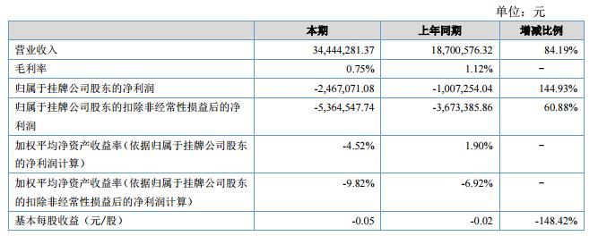 報(bào)告期內(nèi)發(fā)生營(yíng)業(yè)成本3,418.48萬(wàn)元,較上年同期1,849.06萬(wàn)元增長(zhǎng)84.88%,增長(zhǎng)主要原因是公司報(bào)告期實(shí)現(xiàn)營(yíng)業(yè)收入大幅增加營(yíng)業(yè)成本相應(yīng)增長(zhǎng)所致。報(bào)告期實(shí)現(xiàn)凈利潤(rùn)-246.71萬(wàn)元,較上年同期-100.73萬(wàn)元增長(zhǎng)-144.93%。?