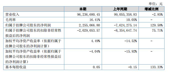 2018年上半年公司營業(yè)收入9,623.67萬元,比上年同期的9,905.54萬元下降了2.85%。本期毛利率為16.41%,上年同期的毛利率10.05%有了較大幅度地上升。報(bào)告期內(nèi),公司的凈利潤為225.51萬元,同比上升了129.58%。