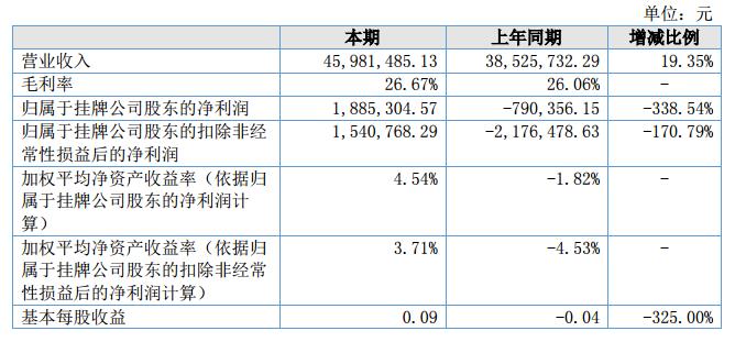 報(bào)告期內(nèi)實(shí)現(xiàn)營業(yè)收入45,981,485.13元,同比增長19.35%;公司營業(yè)成本33,718,838.50元,同比增長18.37%;銷售費(fèi)用為2,550,867.25元,同比增加416133.38元。財(cái)務(wù)費(fèi)用593,809.12元,同比增加136,481.31元;公司實(shí)現(xiàn)歸屬于掛牌公司股東的凈利潤1,885,304.57元,同比增長338.54%,主要是公司積極拓展市場(chǎng),提高了產(chǎn)品的銷量,營業(yè)收入同比增加了19.35%。?