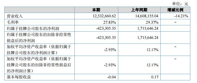 本期實(shí)現(xiàn)營(yíng)業(yè)收入12,532,660.62元,較上年同期減少2,075,494.42元,減少了14.21%,公司營(yíng)業(yè)成本9,044,729.65元,較上年同期減少1,273,038.44元,減少了12.34%。本期歸屬于掛牌公司股東的凈利潤(rùn)為-423,305.35元,上年同期1,715,646.24元。