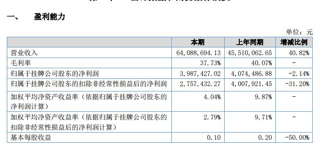 2018 年上半年公司簽訂的合同保持穩(wěn)定,實現(xiàn)營業(yè)收入 6,408.87 萬元,營業(yè)成本 3,990.74 萬元,凈利潤 398.74 萬元;上年同期營業(yè)收入 4,551.01 萬元,營業(yè)成本 2,727.48 萬元,凈利潤 407.45 萬元;本期與上年同期相比分別增長 40.82%、46.32%及-2.14%。營業(yè)收入與去年同期增長較大的主要原因是本報告期的生產(chǎn)經(jīng)營規(guī)模較去年擴大,完工驗收項目比去年同期增多;營業(yè)成本增加較多的主要原因是原材料成本及直接人工成本上升;凈利潤下降的主要原因是制造成本增長,員工增加及工資水平上升導(dǎo)致期間費用增加較多,研發(fā)費用比去年同期增長較多。