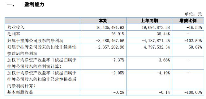 報告期內(nèi)公司實現(xiàn)營業(yè)收入 1,643.55 萬元,較上年同期減少 325.94 萬元,減幅 16.55%;歸屬于掛牌公司股東的凈利潤 -848.05 萬元,較上年同期減少 429.26 萬元,減幅 102.50%。
