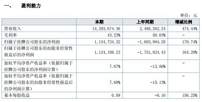 報告期內,公司實現(xiàn)凈利潤為 113.47 萬元,較上年同期增長 170.74%。主要原因為:本期營業(yè)收入增加了 1,180.54 萬元,營業(yè)總成本增加了 893.03 萬元,投資收益增加 4.45 萬元,所得稅增加 17.85 萬元所致。