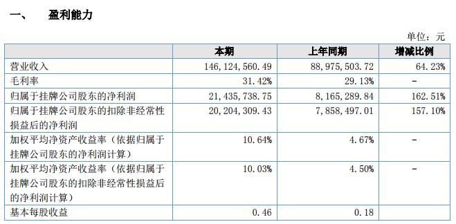 上半年實(shí)現(xiàn)營業(yè)收入 14,612.46 萬元,比上年同期 8,897.55 萬元增長 64.23%,實(shí)現(xiàn)產(chǎn)品毛利 4,591.23 萬元,毛利率 31.42%,實(shí)現(xiàn)歸屬于掛牌公司股東的凈利潤 2,143.57 萬元,比上年同期 816.53 萬元增長 162.51%。