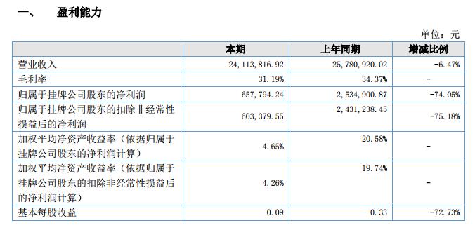報(bào)告期內(nèi),營業(yè)收入 24,113,816.92 元,同比減少 1,667,103.10 元,下降 6.47%。下降主要原因?yàn)楣緢?bào)告期內(nèi)國內(nèi)銷售同比增長 21.84%,出口銷售同比下降 61.96%,系國外訂單正式下單較晚所致;營業(yè)成本 16,593,260.77 元,同期下降 1.94%,主要系收入下降導(dǎo)致成本下降;凈利潤為 657,794.24 元,同比減少 1,877,106.63 元,下降 74.05%,下降主要原因?yàn)閳?bào)告期內(nèi)出口銷售下降 61.96%,導(dǎo)致報(bào)告期收入下降,其他收益增值稅退還同比下降 50.30%。