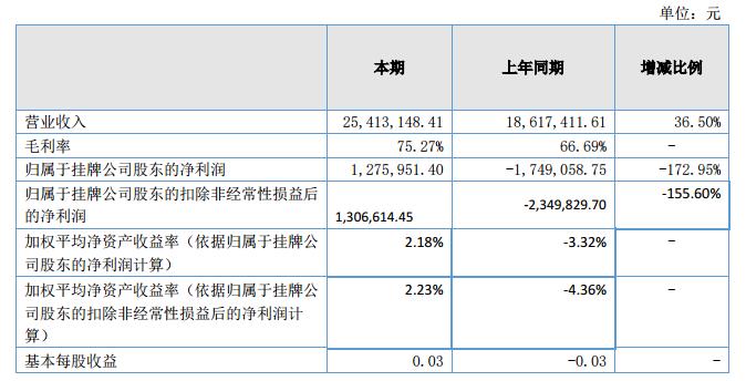 報告期末,公司實現(xiàn)營業(yè)收入為2541.31萬元,較上年同期增加679.57萬元,增幅比例36.5%,報告期實現(xiàn)凈利潤123.82萬元,比上年同期增長333.79萬元,凈利潤實現(xiàn)增長的主要原因在于銷售額增加,成本水平下降,毛利率提高。?
