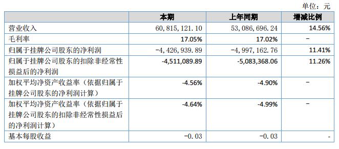 報(bào)告期內(nèi),公司營(yíng)業(yè)收入為60,815,121.10元,較上年同期增長(zhǎng)了14.56%,主要因?yàn)橄掠问袌?chǎng)需求穩(wěn)步增長(zhǎng),優(yōu)質(zhì)客戶需求量增加以及國(guó)外市場(chǎng)的拓展使得業(yè)務(wù)量也有所提升。營(yíng)業(yè)成本為50,449,154.64元,比上年同期增長(zhǎng)了14.52%,與營(yíng)業(yè)收入的增長(zhǎng)基本一致。公司毛利率為17.05%,與上年同期基本持平。本期凈利潤(rùn)為-4,501,226.08元,較上年同期減少了579,817.43元的虧損,主要原因是本期資產(chǎn)減值損失較上年同期減少680,483.06元。?