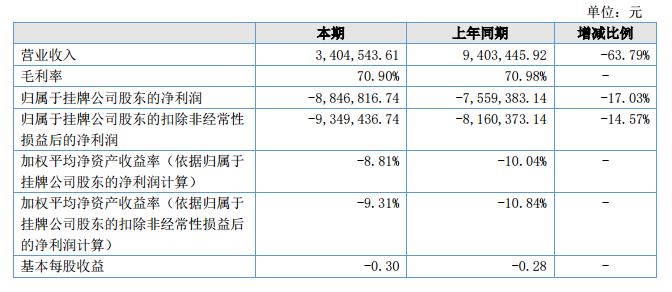 報(bào)告期內(nèi),營(yíng)業(yè)收入340.45萬(wàn)元,同比下降63.79%,營(yíng)業(yè)利潤(rùn)是-960.64萬(wàn)元,同比去年同期下降了20.23%,歸屬于公司股東的凈利潤(rùn)-884.68萬(wàn)元,同比下降17.03%。?