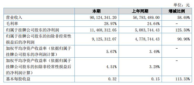 報告期內(nèi),公司實現(xiàn)營業(yè)收入90,124,341.20元,較上年同期增加33,330,852.20元,同比增長58.69%;本期實現(xiàn)利潤:11,468,312.05元,比去年同期增長125.59%。?