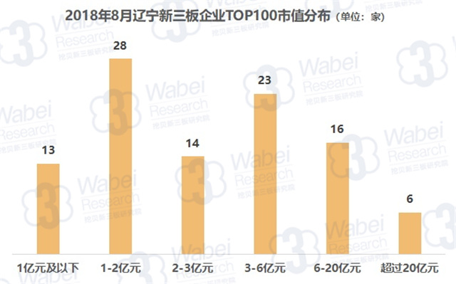TOP100上榜門檻為0.87億元,其中有6家企業(yè)市值超過20億元,而市值在1億元及以下、1-2億元、2-3億元、3-6億元、6-20億元的企業(yè)分別有13家、28家、14家、23家、16家。