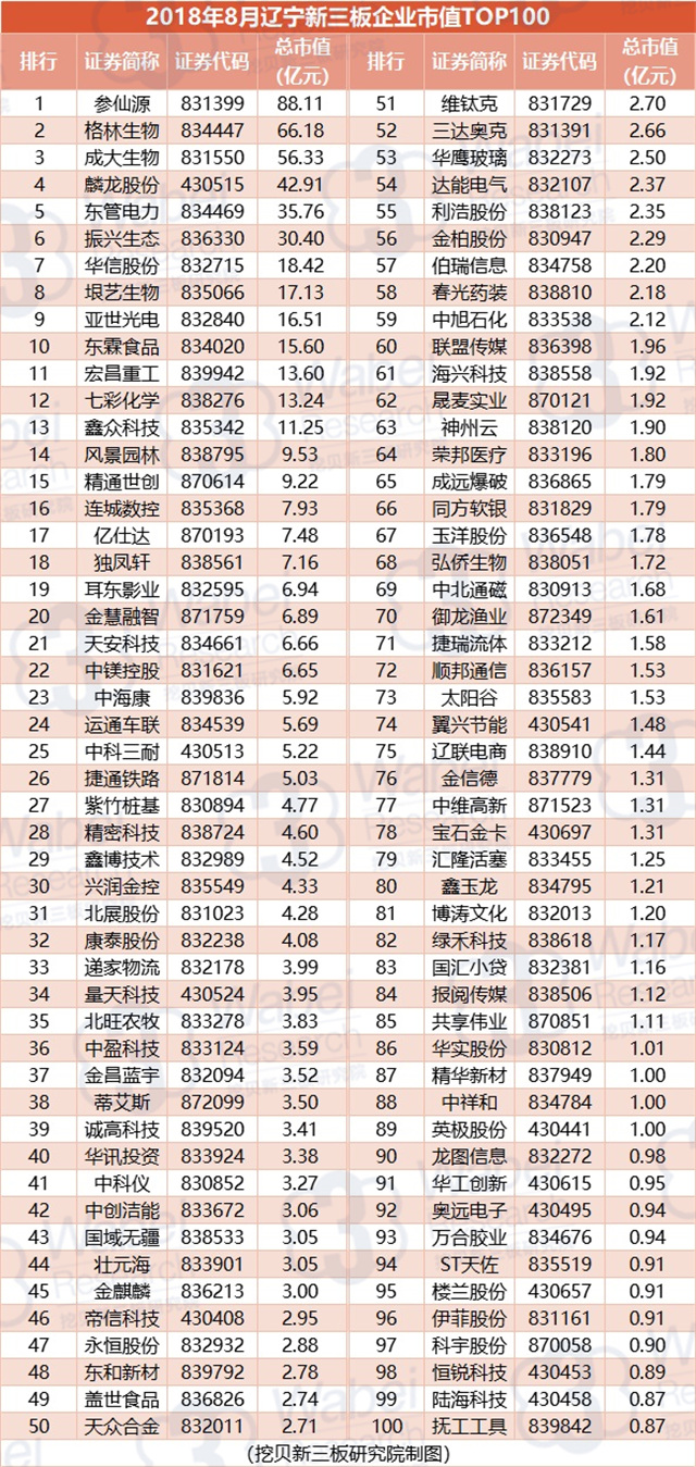 附:2018年8月遼寧新三板企業(yè)市值TOP100