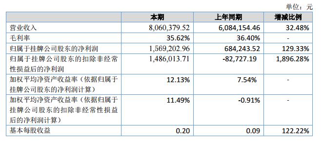 報(bào)告期內(nèi),公司實(shí)現(xiàn)收入8,060,379.52元,比去年同期增長32.48%,利潤總額2,092,270.62元,凈利潤1,569,202.96元,經(jīng)營活動(dòng)產(chǎn)生的現(xiàn)金流量?jī)纛~309,849.08元,投資活動(dòng)產(chǎn)生的現(xiàn)金流量?jī)纛~1,729,728.74元。報(bào)告期內(nèi)收入增長的原因?yàn)槭袌?chǎng)需求上升、市場(chǎng)知名度上升。利潤總額和凈利潤分別增長188.18%、129.33%,增長的主要原因是本期收入增長、同時(shí)管理費(fèi)用中中介等費(fèi)用減少。?