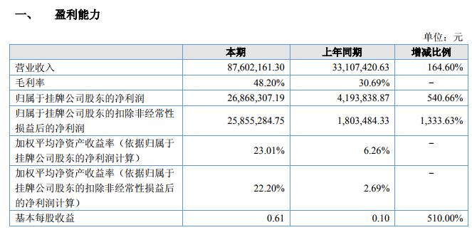 報(bào)告期內(nèi),公司實(shí)現(xiàn)營(yíng)業(yè)收入 87,602,161.30 元,較上年同期增長(zhǎng) 164.60%,為產(chǎn)品銷量增加所致。實(shí)現(xiàn)凈利潤(rùn) 26,868,307.19 元,較上年同期增長(zhǎng) 540.66%,為產(chǎn)品整體毛利率提升所致。經(jīng)營(yíng)活動(dòng)產(chǎn)生的現(xiàn)金流量?jī)纛~ 23,822,253.45 元,較上年同期增長(zhǎng) 245.15%,系銷售商品收到的現(xiàn)金增加所致。