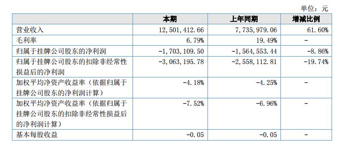 報告期內(nèi),公司實現(xiàn)營業(yè)收入12,501,412.66元,較上年同期增加4,765,433.60元,增幅61.60%,主要原因是:公司主要客戶集中在石油開采和復(fù)合材料領(lǐng)域,上年同期時石油開采領(lǐng)域因國際國內(nèi)油價低位運行,石油開采動力不足,需求銳減,2017年下半年至今,國際國內(nèi)油價逐漸企穩(wěn)上行,石油開采市場需求逐漸恢復(fù),帶動公司產(chǎn)品銷量增加。在復(fù)合材料領(lǐng)域,公司產(chǎn)品作為新型填充材料逐漸被用戶行業(yè)企業(yè)認(rèn)可,需求量穩(wěn)步上揚;毛利率為6.79%,較上年同期減少12.70個百分點,主要原因是:原材料價格上漲、制造成本增加、對部分客戶下調(diào)銷售價格等原因共同造成。報告期內(nèi),公司實現(xiàn)凈利潤-1,703,109.50元,較去年同期降低138,556.06元,降幅為8.86%,主要原因是:毛利率降低以及為提升品質(zhì)、降低成本、開拓市場投入的研發(fā)費用增加,研發(fā)費用較去年同期增加47.31萬元,增加比例為44.97%。?