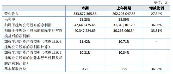 公司實現(xiàn)營業(yè)收入33,387.74萬元,同比上升27.34%。公司實現(xiàn)凈利潤4,264.95萬元,同比上升36.05%;歸屬于掛牌公司股東的凈利潤4,264.95萬元,同比上升36.05%,歸屬于掛牌公司股東的扣除非經(jīng)常性損益的凈利潤4,034.72萬元,同比上升33.31%,凈利潤的增長主要系營業(yè)收入增長所致。?