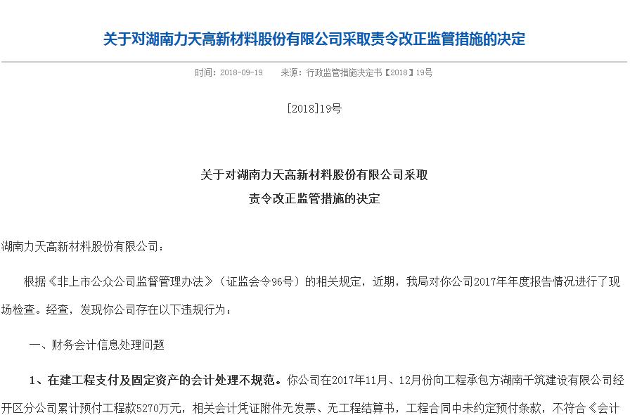 9月19日,湖南證監(jiān)局在官網(wǎng)發(fā)布了《關(guān)于對(duì)湖南力天高新材料股份有限公司采取責(zé)令改正監(jiān)管措施的決定》,對(duì)存在問(wèn)題進(jìn)行了詳細(xì)描述。