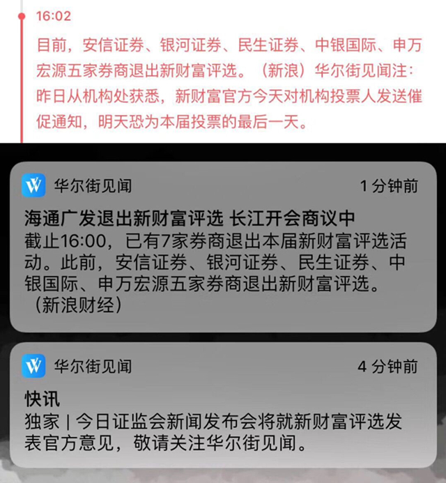 截止到9月21日17:00,據(jù)媒體報(bào)道,安信證券、銀河證券、民生證券、中銀國(guó)際、申萬(wàn)宏源、海通證券、廣發(fā)證券等7家券商正式退出今年新財(cái)富最佳分析師評(píng)選。