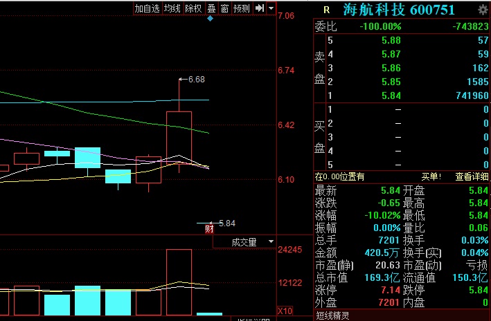 今天是長達8個月停牌后航海科技的第一個交易日,開盤即遭遇跌停,直至收盤。全天共成交7201手,成交額為420.5萬,換手率僅0.03%。截至收盤,海航科技報收于5.84元,跌幅為10.02%,封單超74萬手。