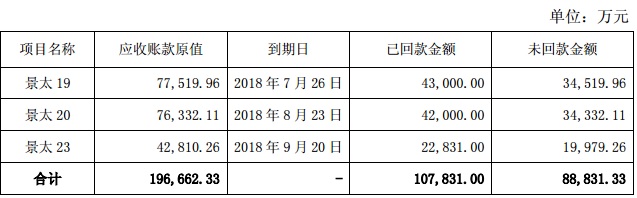 公告顯示,截至9月25日,華業(yè)資本應(yīng)收賬款業(yè)務(wù)累計(jì)出現(xiàn)逾期未回款的金額為8.88億元,占公司2017年12月31日經(jīng)審計(jì)凈資產(chǎn)的 13.06%。華業(yè)資本的應(yīng)收賬款逾期未回款部分,全部來自于景太項(xiàng)目。
