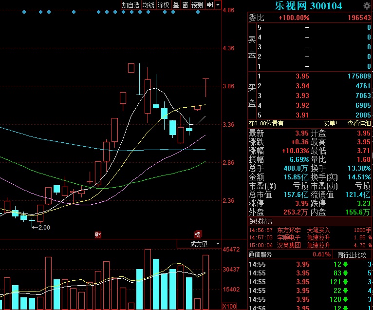 9月26日,樂視網(wǎng)報(bào)收于3.95元/股,繼續(xù)漲停,封單17.58萬手。
