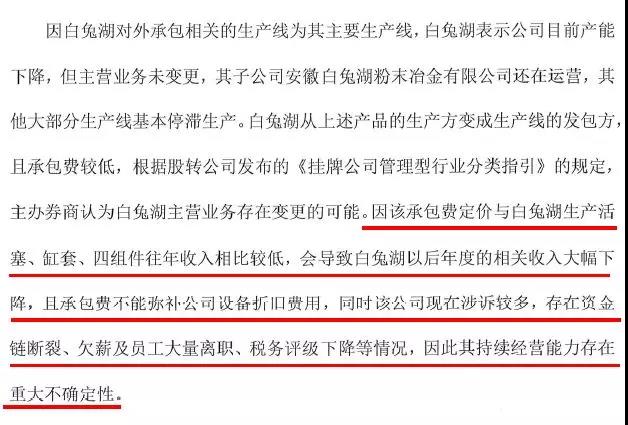 主辦券商在風(fēng)險(xiǎn)提示公告中直言,白兔湖生產(chǎn)基本停滯,主營(yíng)業(yè)務(wù)可能變更,另外公司涉訴較多,存在資金鏈斷裂、欠薪及員工大量離職等情況,其持續(xù)經(jīng)營(yíng)能力存在重大不確定性。